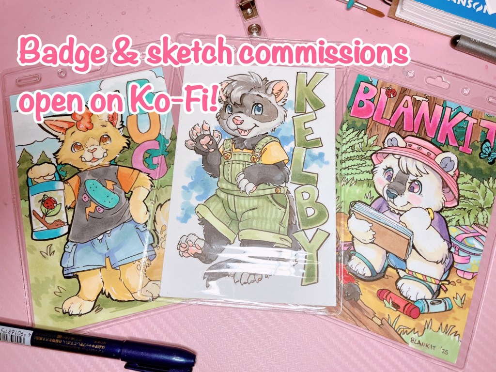I did finally mamage to get my sketch commission information together. My current plan is to open for smaller commissions (sketch & marker badges) over on Ko-Fi. I’ve never used Ko-Fi before so we’ll see how this goes! I also want to try out the shop feature for old enamel pins and new stickers.